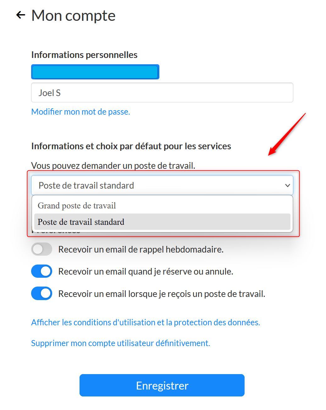 Par défaut, en tant que demandeur, le système vous attribue des postes standards. Si vous souhaitez que la plateforme vous attribue un autre type de poste par défaut, vous pouvez modifier ce paramètre dans votre compte.